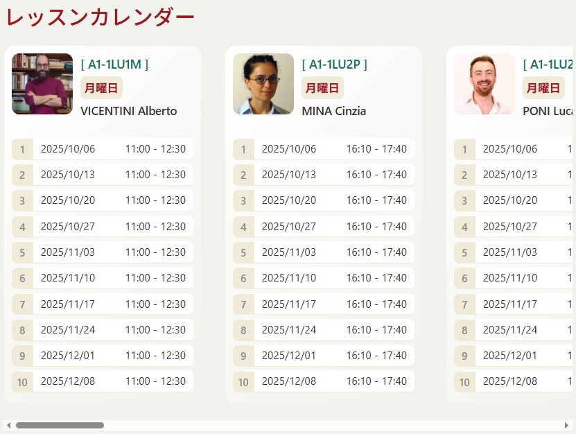 10月6日(月)から開始する2025年秋学期では、16もの「曜日・時間帯」を設定していますので、どの希望にも添うようなレッスン形式のクラスをお選びいただけます。
